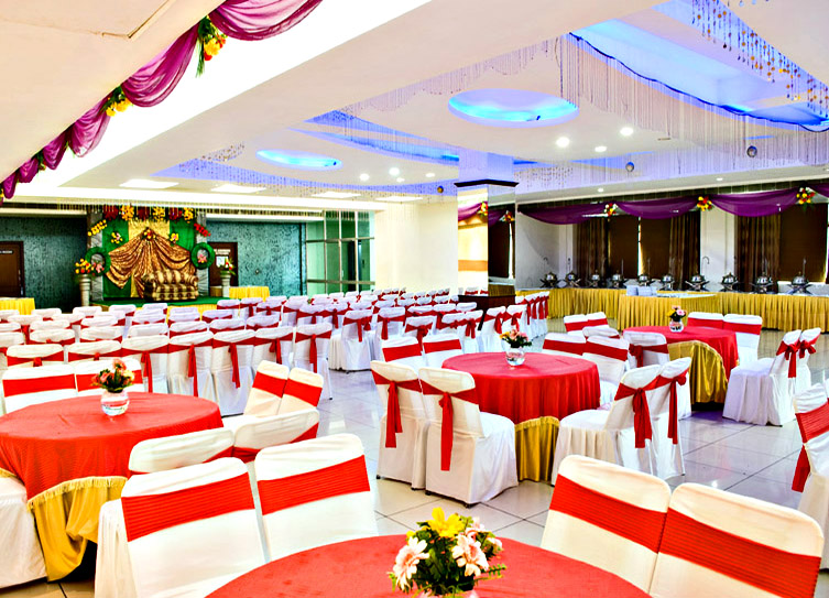 The Golden Palms Hotel is located in Patparganj in East Delhi. It is a premium 3 Star wedding venue. The hotel stands out due to its unique color combination and lovely interiors. The green belt around the venue makes it a very quiet and nice venue for marriage ceremonies like Ring Ceremony, Engagement, Sangeet, Mehandi, Theme Wedding and Reception Parties. The party areas are specious and very nicely decorated. Golden Palms Hotel & Spa has two banquet halls named Nirvana and Nilaya. Total capacity is of 320 guests. The halls are air conditioned and have very nice interiors. They require very little decoration. This venue has 50 rooms also where your outstation guests can stay. Both vegetarian and non vegetarian cuisines are offered. Package starts at Rs 1200 per plate for vegetarian food and Rs 1400 per plate for non vegetarian food. Alcohol is served here. A complementary bridal room is provided. The staff is very cultured and professional. Seating arrangement, food layout and service are excellent. This is an ideal venue for small and mid size functions and corporate events.